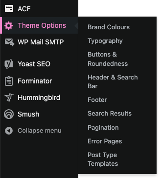 Upon signing in for the first time, you would then be able to configure your Theme Options, where aspects such as brand colours, typography, navigation style, footer style, and post archives may all be configured)