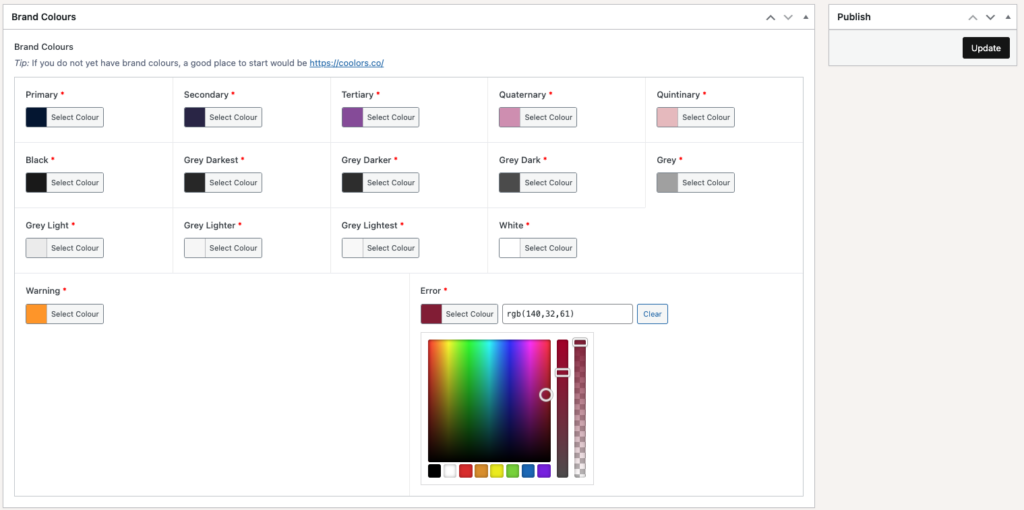 Once brand colours have been configured, click on the ‘Update’ button to the right side of the screen in order to save any changes.
