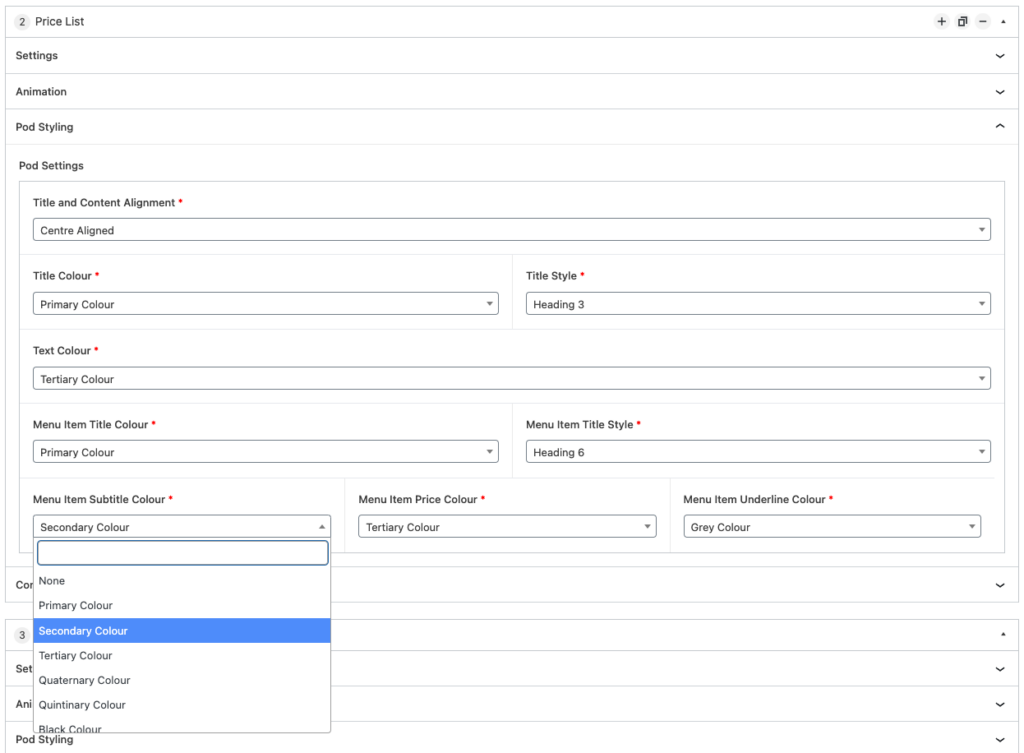 Note that once configured, brand colours may be selected as background / text / foreground colours across all applicable components, along with the navigation bar and footer.