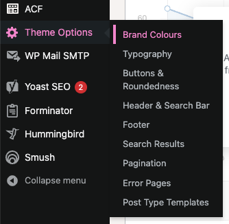 To assign your brand colours, hover over ‘Theme Options’ within the sidebar, and select the ‘Brand Colours’ option within the submenu.
