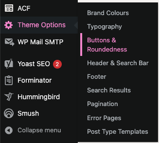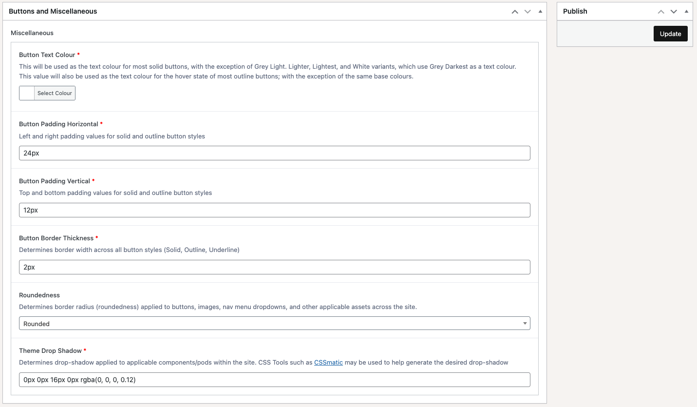 The ‘Buttons & Roundedness’ section provides administrators with the ability to alter button styles, adjust roundedness of various on-site components (including buttons), as well as controlling the box-shadow applied to components on the website. (Note that the latter will require some basic css knowledge).