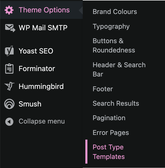 In order to tweak the design of any of these post types, navigate to ‘Theme Options > Post Type Templates’.