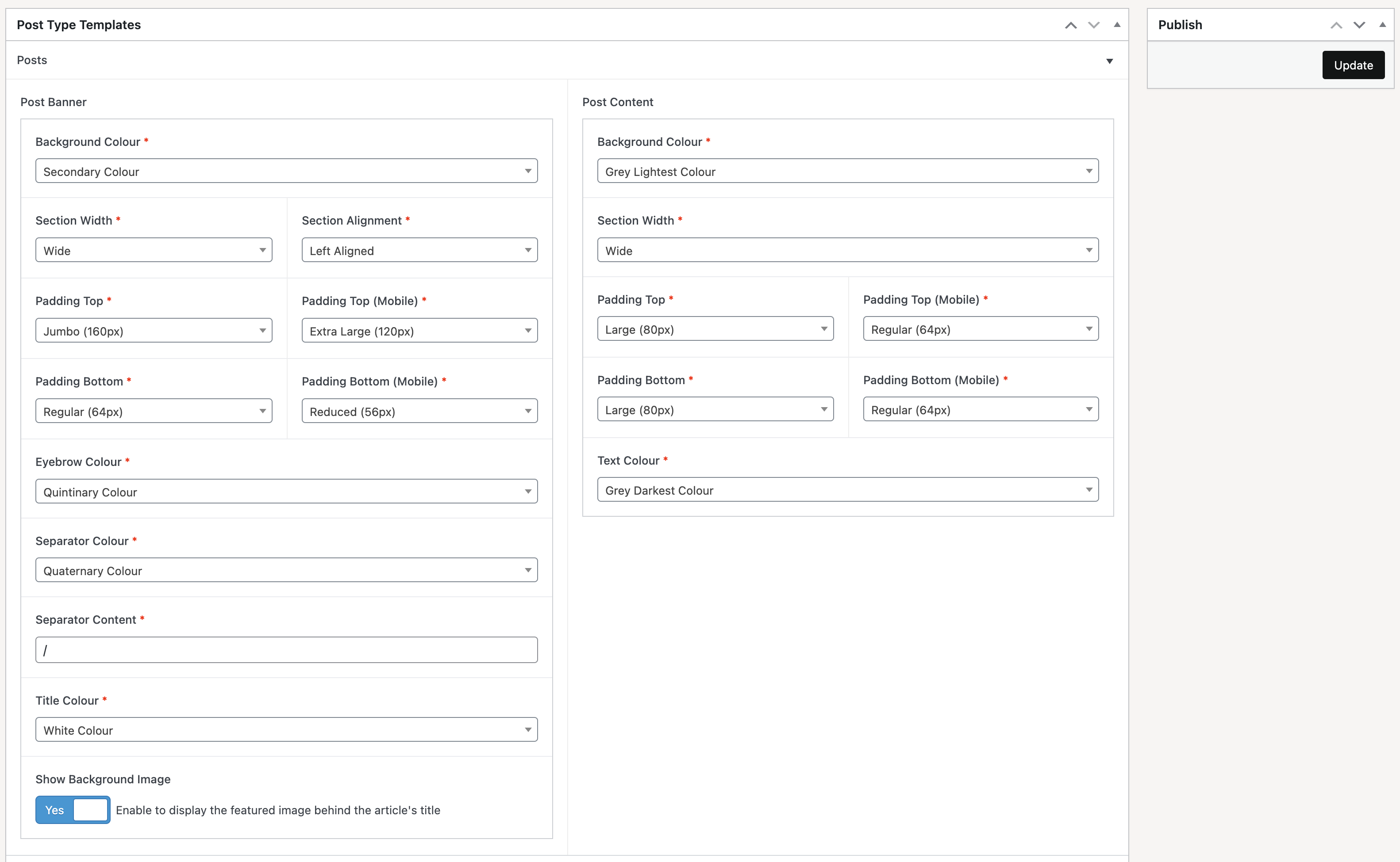 This section is split into two sub-sections, allowing configuration of the post banner, as well as the actual content section, as per the below image.