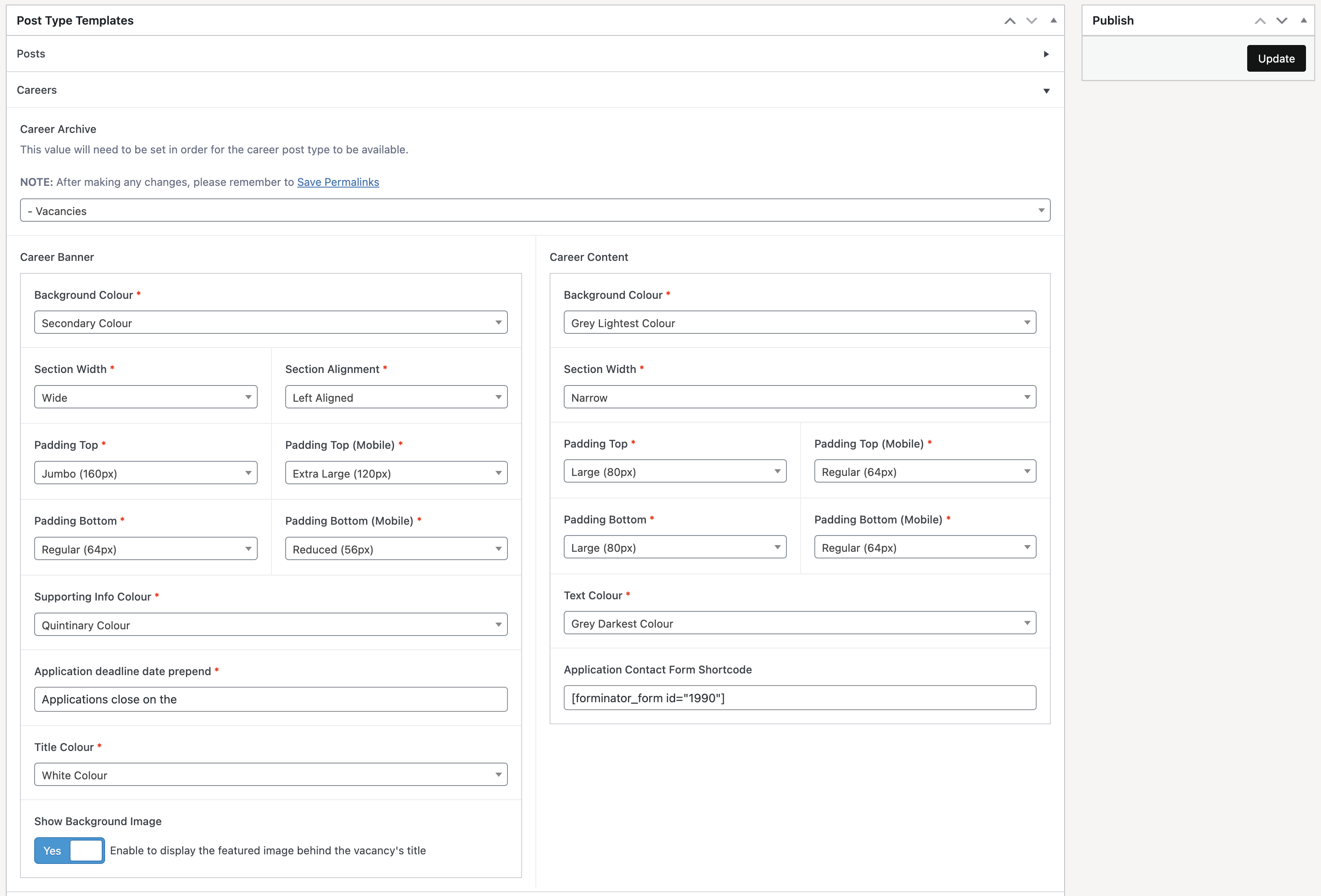 The ‘Careers’ accordion section allows administrators to set the style for individual vacancy pages, as well as determining which page to use as this post type’s archive.