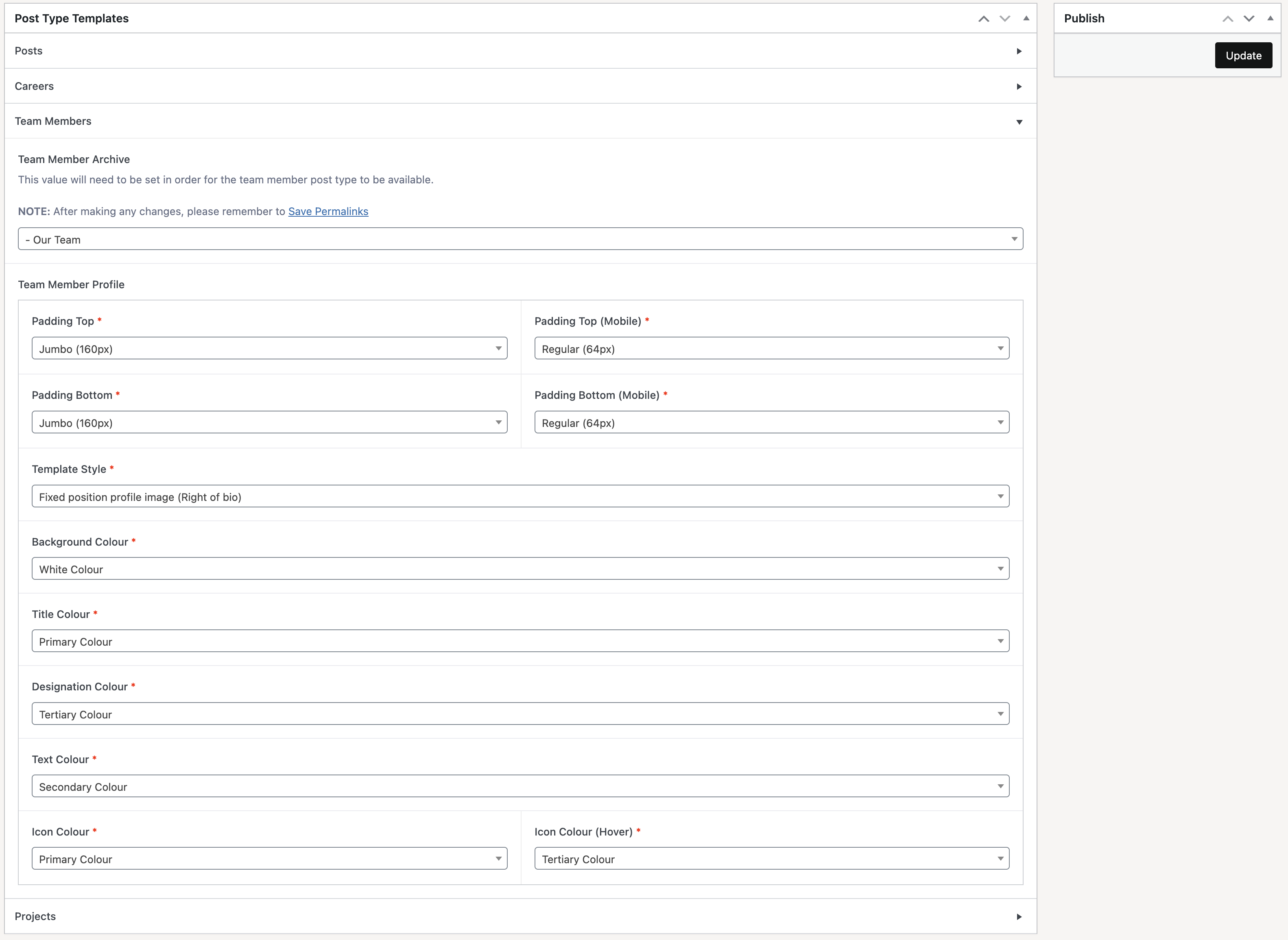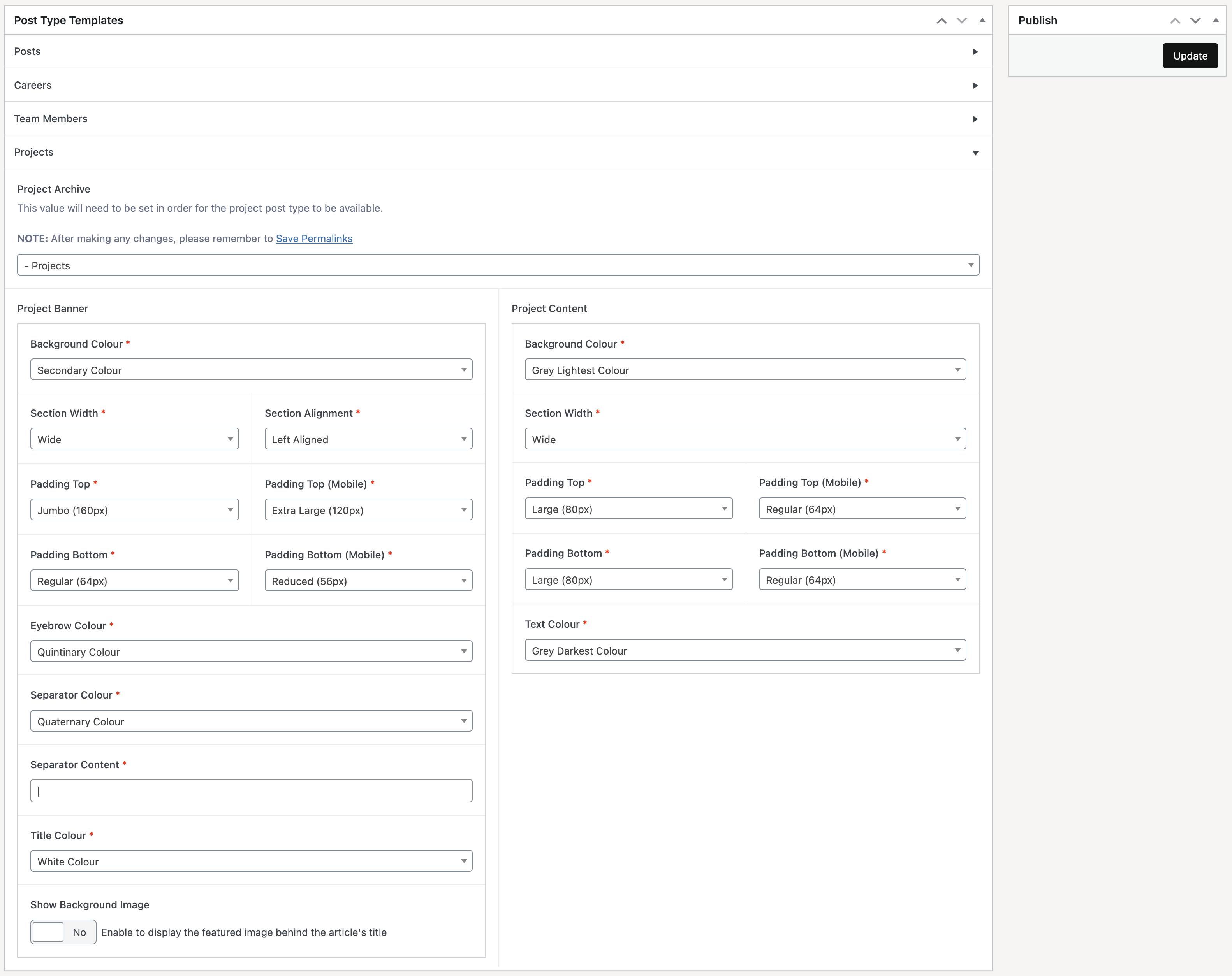 The ‘Projects’ accordion section allows administrators to set the style for individual project pages, as well as determining which page to use as this post type’s archive.
